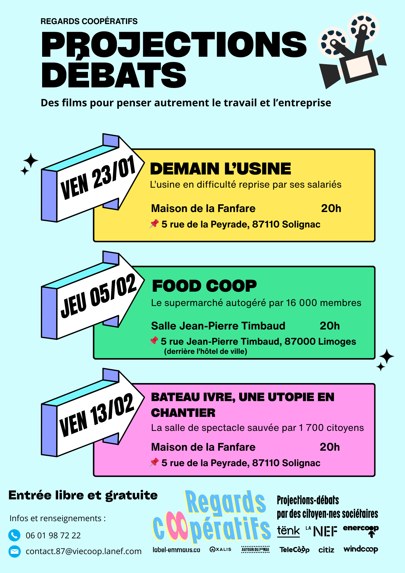 Il mobilise les citoyen·ne·s sociétaires de 8 coopératives en mettant à leur disposition des films documentaires afin qu'ils·elles organisent des projections-débats sur leur territoire.